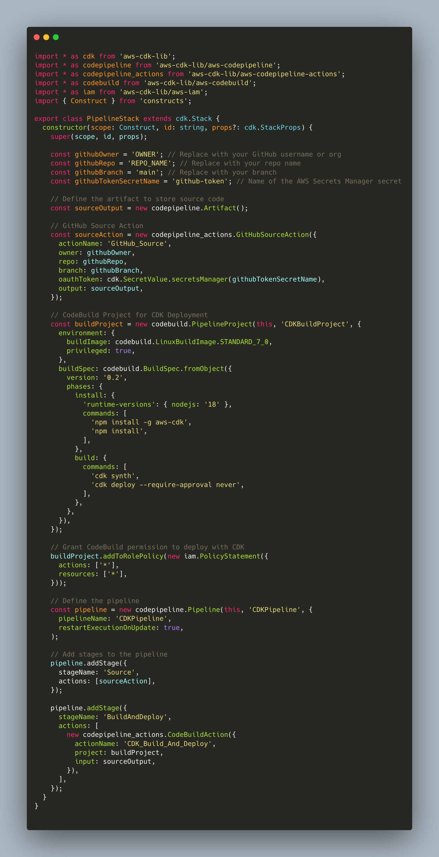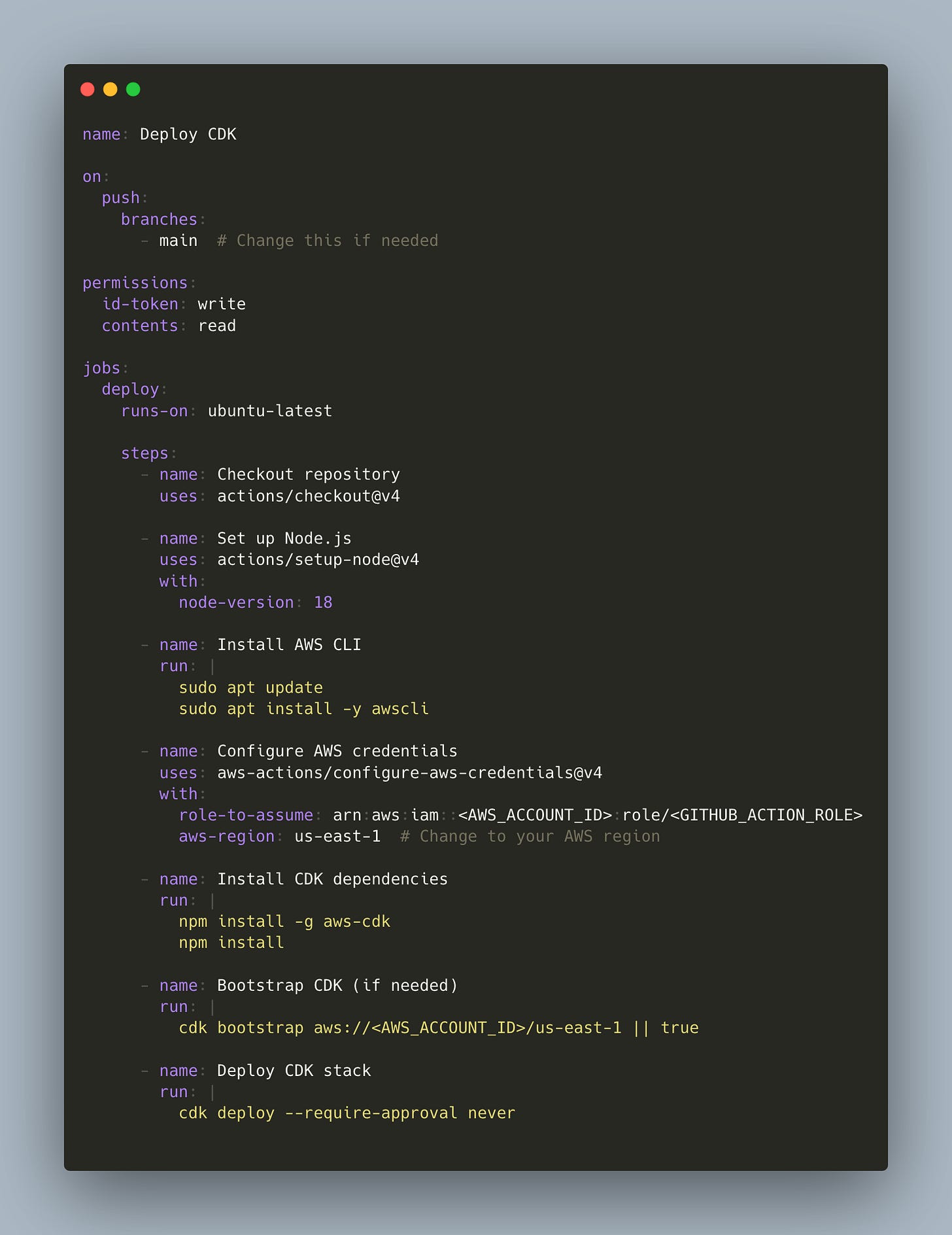 As your project gains traction, it will likely exceed what is reasonable for manual CLI deployments. At this point, you’ll need to decide how to automate your deployments. Since CDK is a CloudFormation (or Terraform) synthesizer, setting up a process to accomplish this is fairly open-ended. All you really need is a compute space capable of running CLI commands.